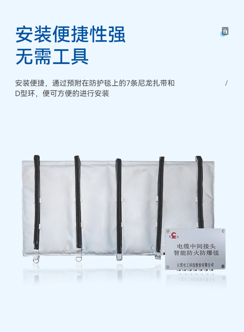 電纜防火防爆毯能抑制中間接頭短路故障所產(chǎn)生的高壓電弧,從而降低了由于電纜接頭事故對周圍人員的潛在傷害風(fēng)險(xiǎn),防爆毯安裝便捷,通過預(yù)附在防護(hù)毯上的7條尼龍?jiān)鷰Ш虳型環(huán),可以方便地將其加裝在施工完成的電纜中間接頭外,無需其它工具。