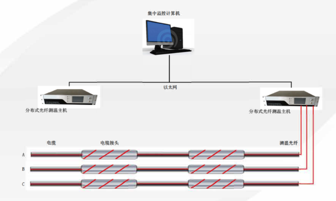 系統(tǒng)由測溫主機、監(jiān)測軟件、感溫光纜及相關(guān)配件組成,系統(tǒng)能準確探測光纖沿線任意測量點的溫度值。