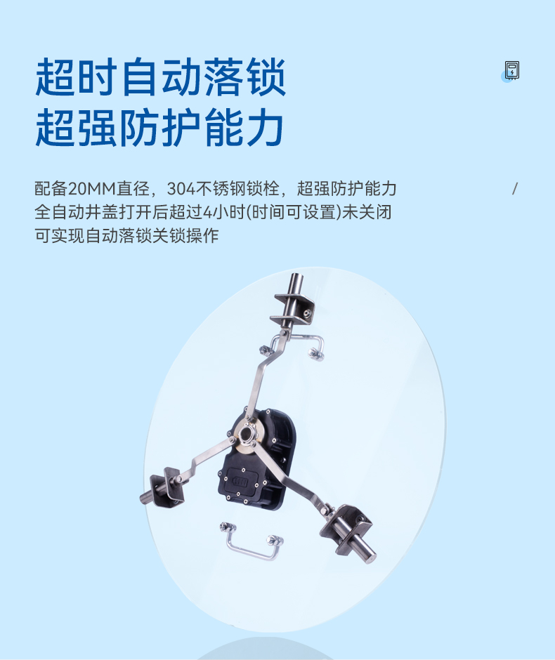 5、全自動井蓋打開后超過4小時(時間可設(shè)置未關(guān)閉,可實現(xiàn)自動落鎖關(guān)鎖操作。