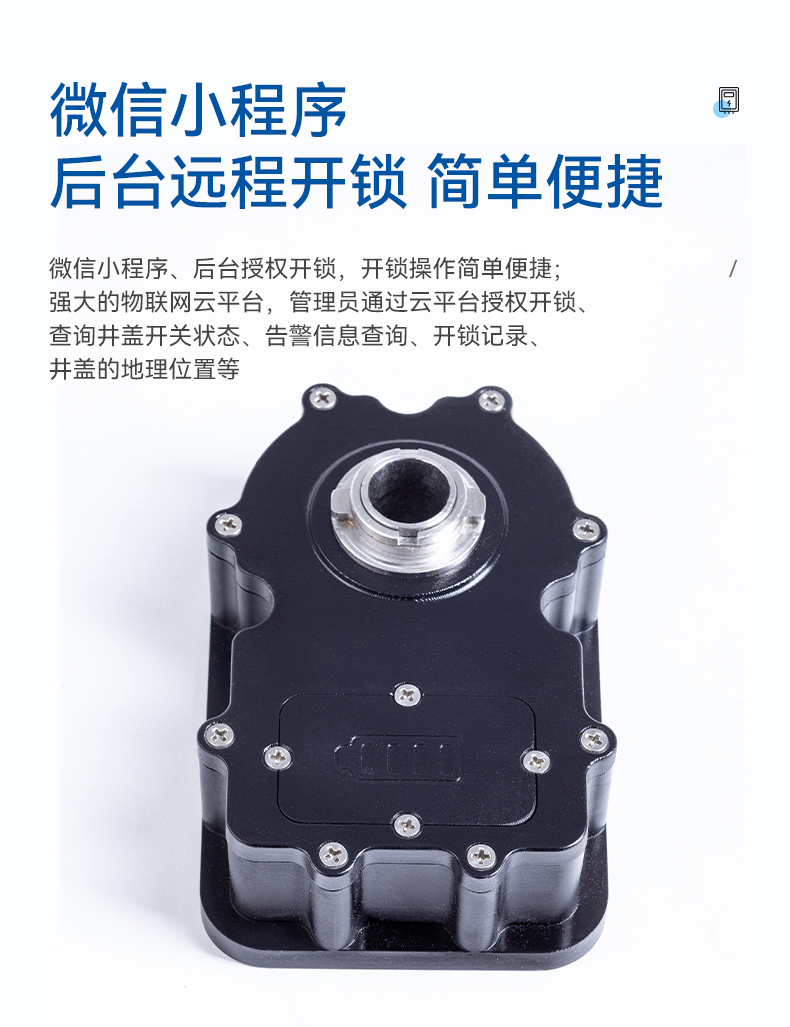 2、強大的物聯(lián)網(wǎng)云平臺,管理員可通過云平臺授權(quán)開鎖、在線派工、查詢并蓋開關(guān)狀態(tài)、告警信息查詢、開鎖記錄、井蓋的地理位置等;