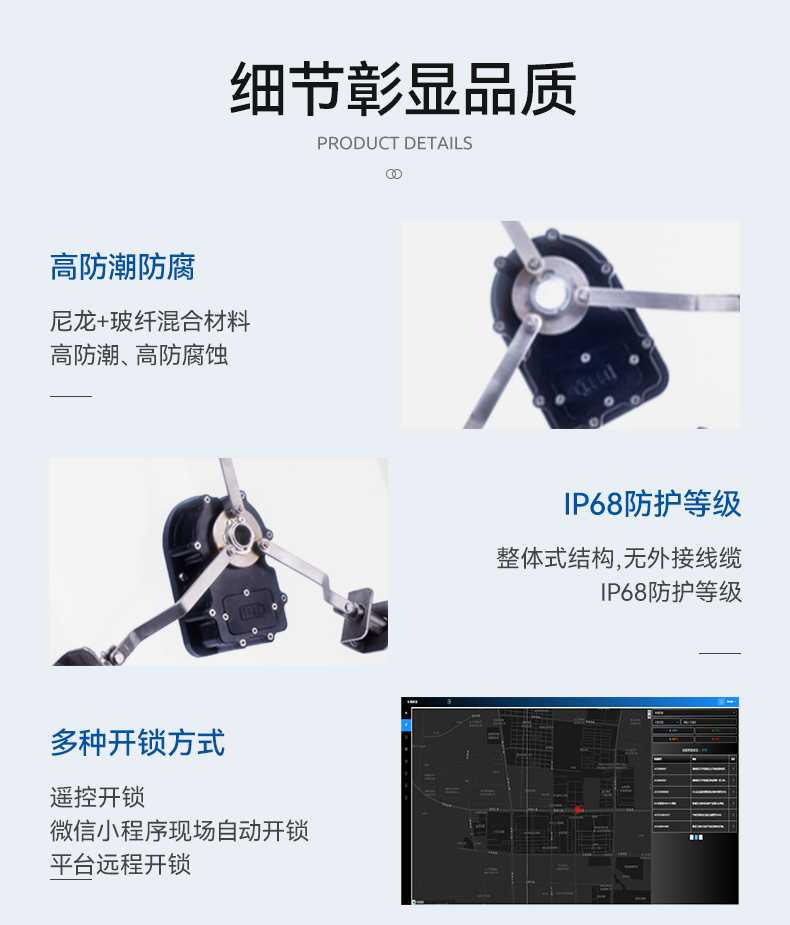 2、強大的物聯(lián)網(wǎng)云平臺,管理員可通過云平臺授權(quán)開鎖、在線派工、查詢并蓋開關(guān)狀態(tài)、告警信息查詢、開鎖記錄、井蓋的地理位置等;
